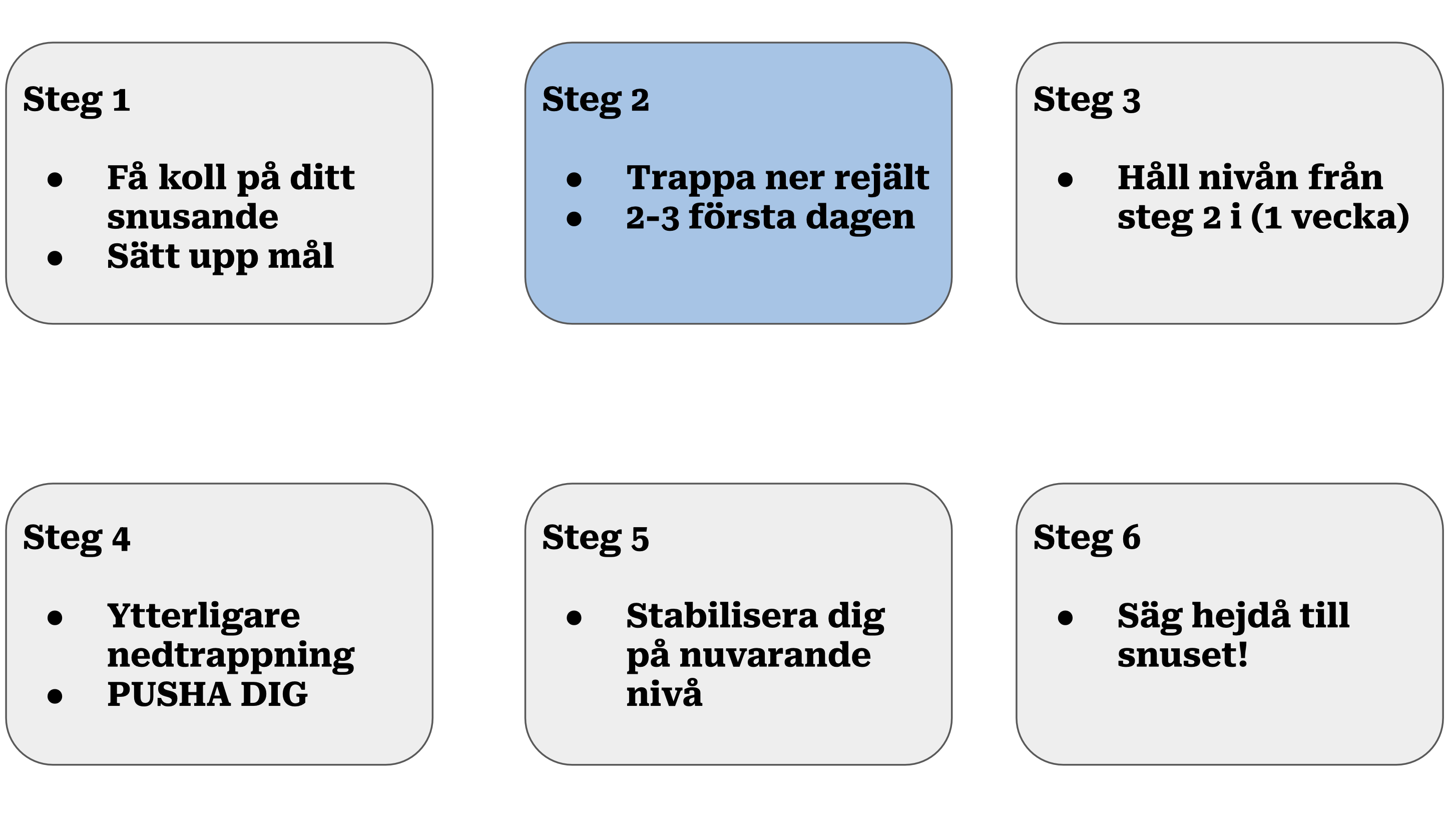 Den andra veckan bygger på att vänja dig vid en ny normalnivå av snusande – alltså ska du stabilisera dig på en nivå här, och inte trappa ner ytterligare under denna vecka.