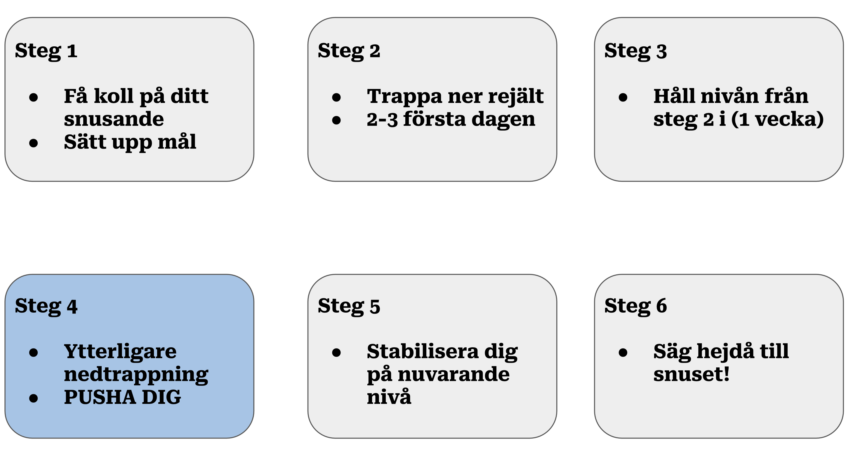 Nu mår du nog generellt sett ganska halvtaskigt. Du är van att törsta efter en till härlig snus. Men en god nyhet är att under fjärde veckan behöver du inte trappa ner mer. Här ska snusandet redan vara på en låg nivå jämfört med din normalnivå, och denna vecka ska låta dig vänja dig lite grann vid den nivån.