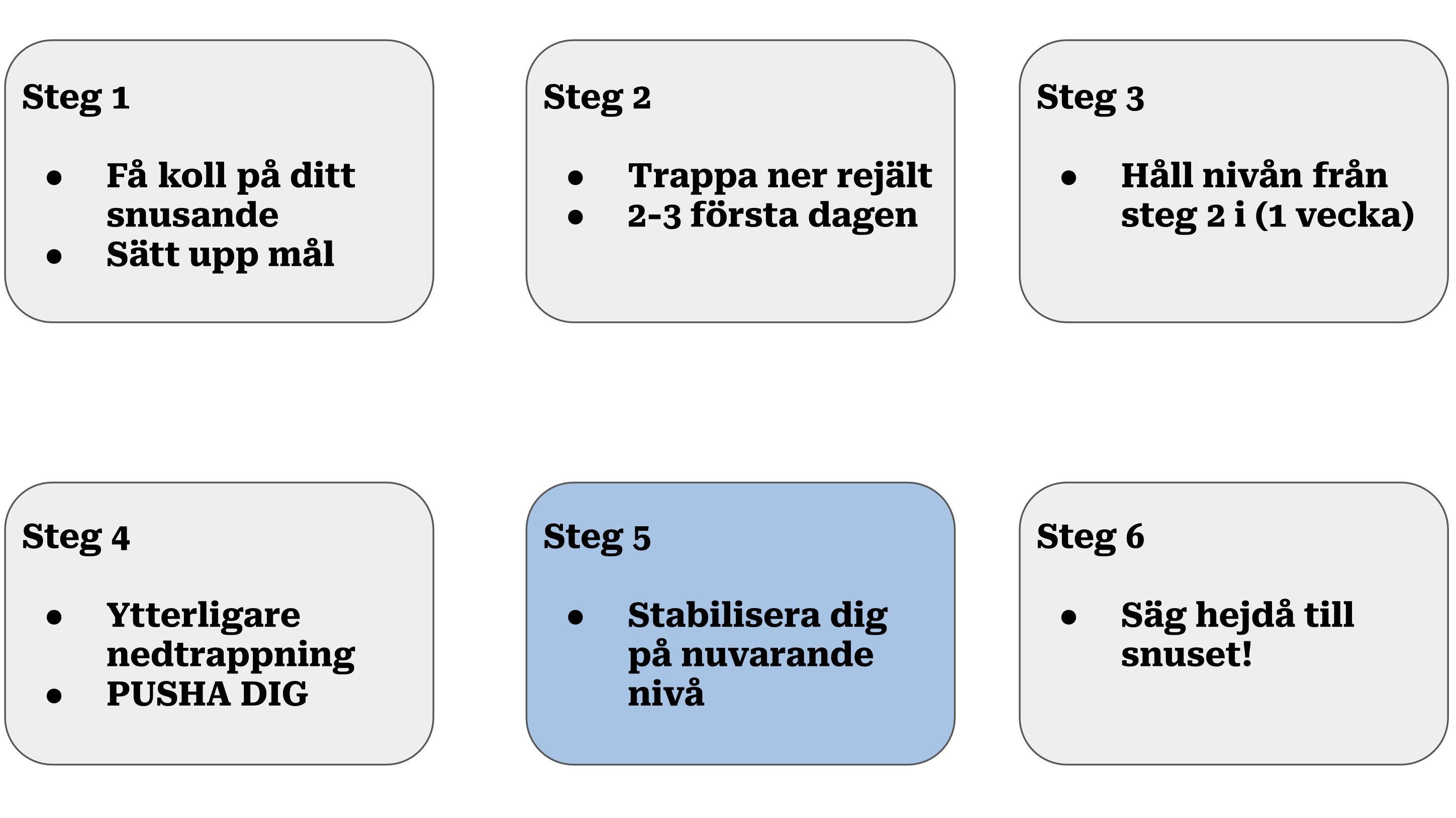 Nu är vi på vecka 5 sedan vi påbörjade nedtrappningen. Du ska nu sluta helt. Aldrig mer ska en prilla in under läppen (åtminstone inte en med nikotin).