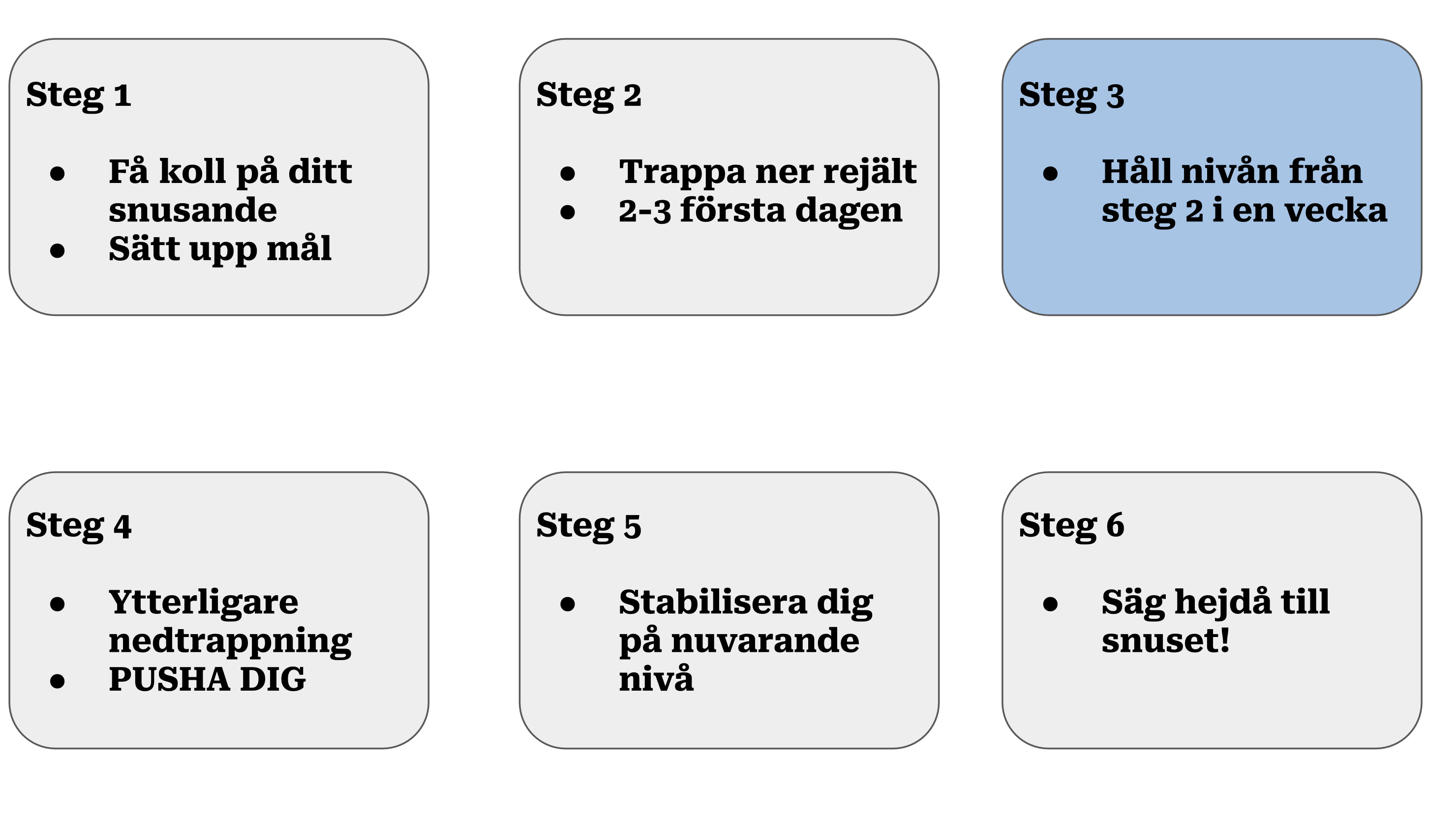 Den tredje veckan ska du nu istället sikta på att pusha dig stenhårt. Inget steg i nedtrappningen är enkelt – men det är inte enkelt att sluta snusa, och det ska det heller inte vara.