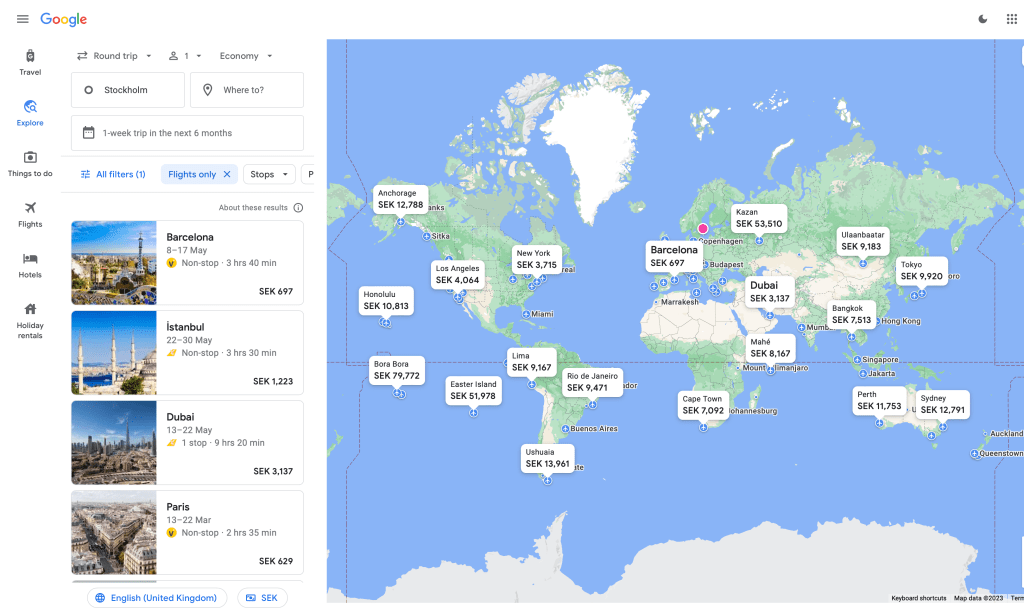 Gör så här: Gå in på Google flights, välj avreseort och se priser över hela världen – du kommer få upp de billigaste priserna till en mängd destinationer på världskartan, och du kan zooma in för att se priser till olika städer i ett givet land. Du kommer snabbt inse att det kan vara tre gånger så dyrt att flyga till grannstadens flygplats.